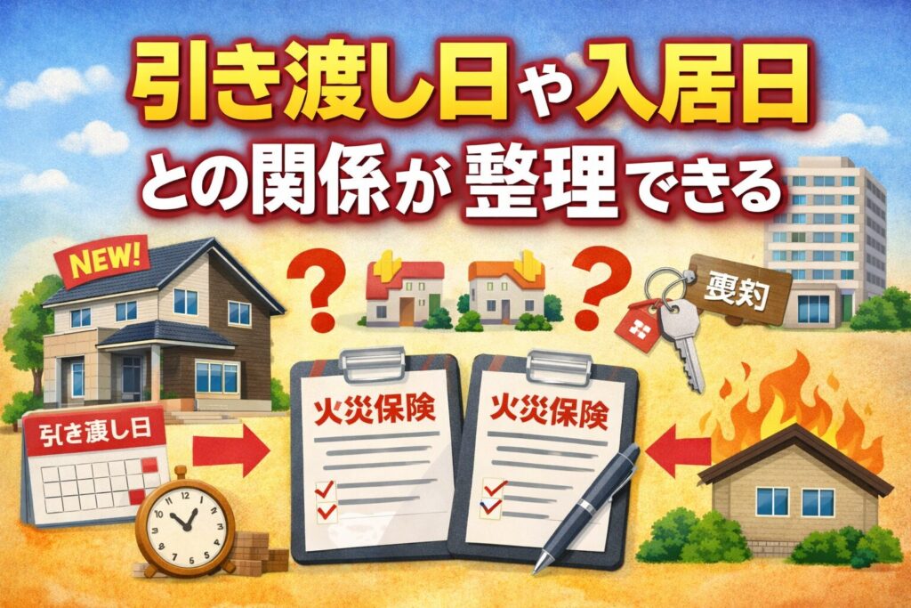 実際に寝泊まりする日ではなく、契約や引き渡しで責任が移る日。この考え方は本当に重要です。ここを勘違いすると、数日とはいえ無保険期間が発生してしまう可能性があります。