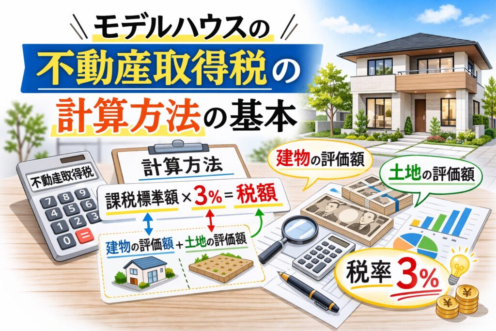 モデルハウスの不動産取得税は、基本的には建売住宅と同じルールで計算されます。
