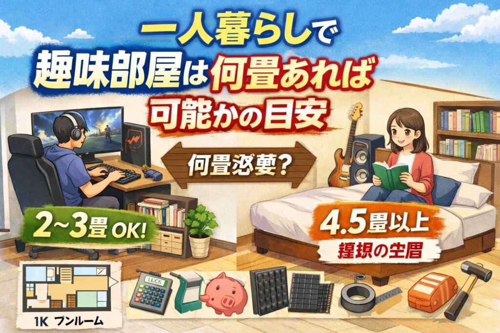 一人暮らしの趣味部屋間取りは、広さよりゾーニングが重要です。6畳ワンルームでも工夫次第で十分可能ですし、1LDKならさらに自由度が高まります。